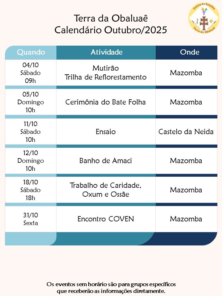 No momento, a Terra de Obaluaê passa por um período de transição. A sede própria já foi adquirida em Mazomba, Itaguaí, mas ainda está em processo de reformas. Por conta disso, nosso espaço físico segue limitado e não conseguimos, por enquanto, acolher todas as pessoas interessadas em conhecer e participar dos nossos trabalhos.